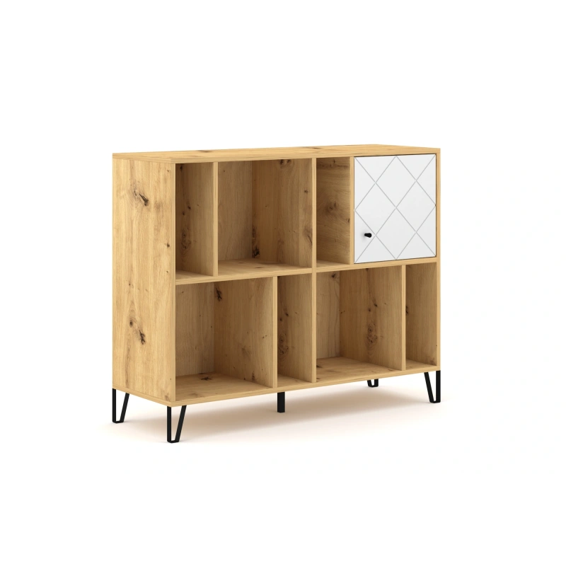 Regał BILBAO BL09 to nowoczesny mebel, który łączy funkcjonalność z eleganckim designem. Połączenie ciepłego dekoru dąb artisan z białym matem nadaje wnętrzu świeżości i stylu. Osiem otwartych półek zapewnia dużo miejsca na przechowywanie książek, dekoracji czy innych drobiazgów, a zamykana szafka pozwala ukryć mniej reprezentacyjne przedmioty. Idealny do salonu, biura czy pokoju młodzieżowego.