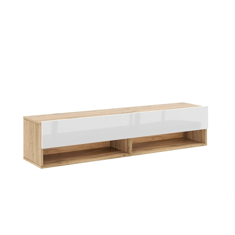 Szafka RTV DERBY 140 to nowoczesny i funkcjonalny mebel, który świetnie sprawdzi się w stylowym salonie. Minimalistyczna forma i eleganckie wykończenie sprawiają, że doskonale wpisuje się w różnorodne aranżacje wnętrz. Zawieszana konstrukcja dodaje lekkości, a przemyślany układ półek i zamkniętej przestrzeni pozwala na uporządkowane przechowywanie sprzętu oraz akcesoriów. Idealna propozycja dla ceniących estetykę i praktyczność.